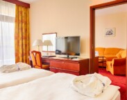 Apartmá komfort: nerekonstruované apartmá s odděleným obývacím pokojem a ložnicí, koupelna, TV/SAT, minibar, telefon, trezor, fén, župan, balkon